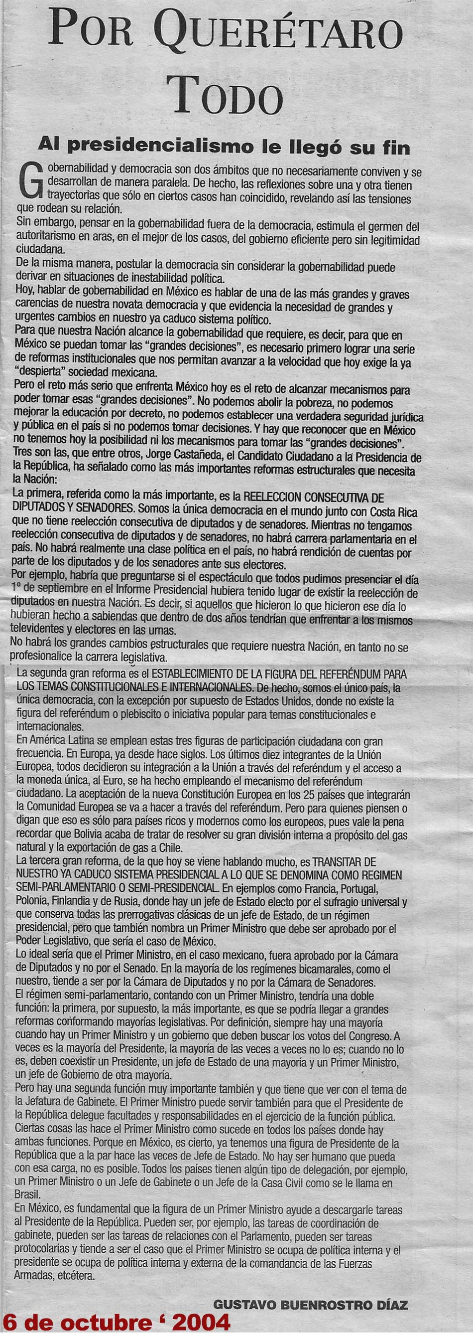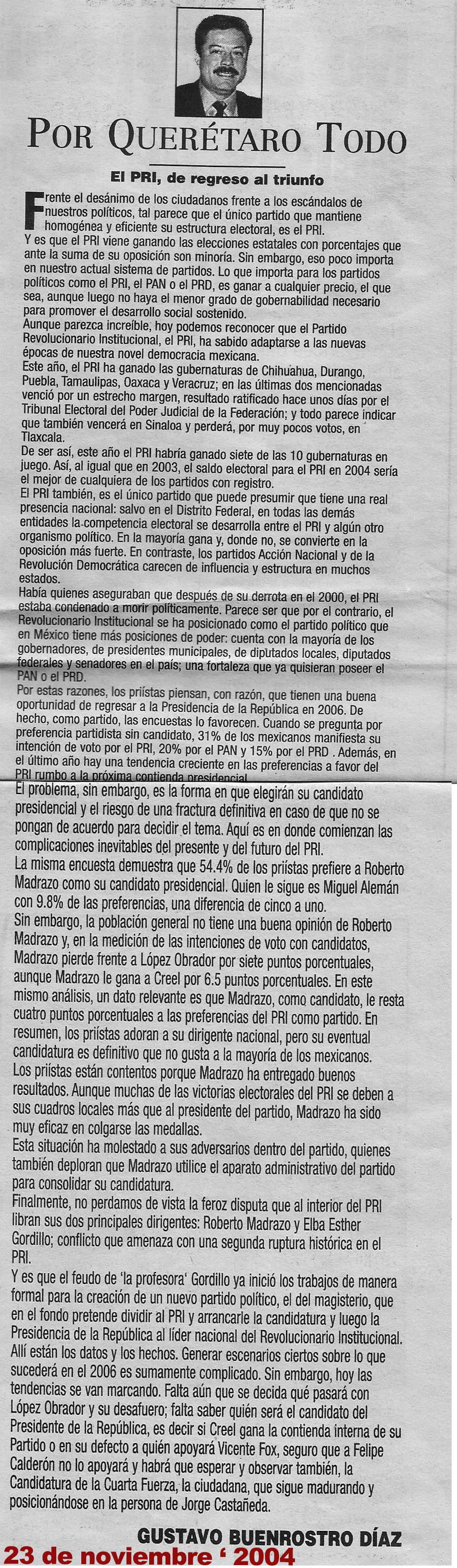 En la siguiente publicación se menciona la gran oportunidad que tuvo el PRI para regresar a la presidencia de la republica en el 2006, en este análisis de Por Querétaro Todo se pronostico las complicaciones que el PRI tendría para lograr el triunfo, interesante artículo del 23 de noviembre del 2004 de Gustavo Buenrostro.